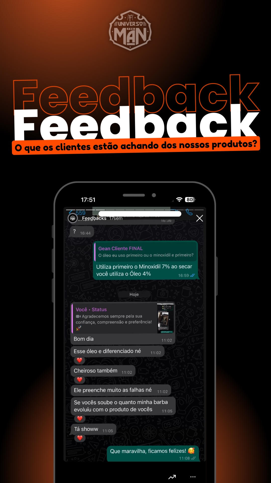 Se você sofre com a queda capilar e alopécia, o Minoxidil da Universo For Man é a solução ideal para você. Nossa fórmula exclusiva é composta por ingredientes cuidadosamente selecionados para estimular o crescimento capilar, proporcionando resultados visíveis e duradouros. Com apenas um frasco, você pode ter cabelos saudáveis e volumosos. Aproveite o FRETE GRÁTIS. Veja os nossos resultados abaixo: