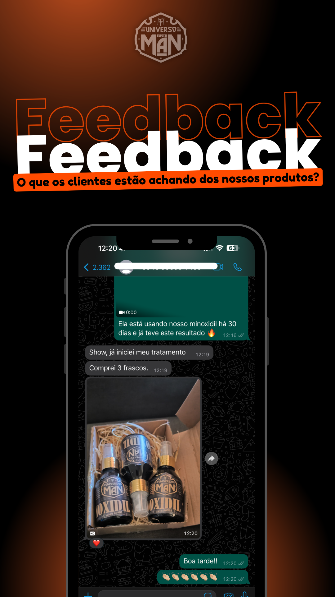 Se você sofre com a queda capilar e alopécia, o Minoxidil da Universo For Man é a solução ideal para você. Nossa fórmula exclusiva é composta por ingredientes cuidadosamente selecionados para estimular o crescimento capilar, proporcionando resultados visíveis e duradouros. Com apenas um frasco, você pode ter cabelos saudáveis e volumosos. Aproveite o FRETE GRÁTIS. Veja os nossos resultados abaixo: